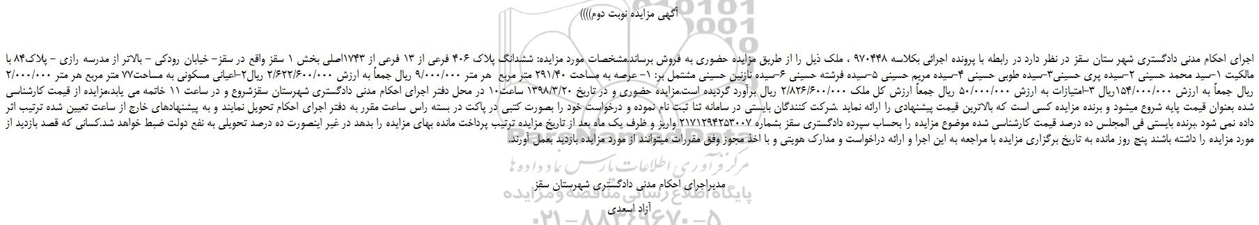 اجرای احکام مدنی دادگستری شهر ستان سقز در نظر دارد در رابطه با پرونده اجرائی بكلاسه 970448 ، ملک ذیل را از طریق مزایده حضوری به فروش برساند.مشخصات مورد مزایده: ششدانگ پلاک 406 فرعی از 13 فرعی از 1743اصلی بخش 1 سقز واقع در سقز- خیابان رودکی - بالاتر از مدرسه رازی - پلاک84 با مالکیت 1-سید محمد حسینی 2-سیده پری حسینی3-سیده طوبی حسینی 4-سیده مریم حسینی 5-سیده فرشته حسینی 6-سیده نازنین حسینی مشتمل بر: 1- عرصه به مساحت 291.40 متر مربع هر متر 9.000.000 ریال جمعاً به ارزش 2.622.600.000 ریال2-اعیانی مسکونی به مساحت77 متر مربع هر متر 2.000.000 ریال جمعاً به ارزش 154.000.000ریال 3-امتیازات به ارزش 50.000.000 ریال جمعاً ارزش کل ملک 2.826.600.000 ریال برآورد گردیده است.مزایده حضوری و در تاریخ 1398.3.20 ساعت10 در محل دفتر اجرای احکام مدنی دادگستری شهرستان سقزشروع و در ساعت 11 خاتمه می یابد،مزایده از قیمت کارشناسی شده بعنوان قیمت پایه شروع میشود و برنده مزایده کسی است که بالاترین قیمت پیشنهادی را ارائه نماید .شرکت کنندگان بایستی در سامانه ثنا ثبت نام نموده و درخواست خود را بصورت کتبی در پاکت در بسته راس ساعت مقرر به دفتر اجرای احکام تحویل نمایند و به پیشنهادهای خارج از ساعت تعیین شده ترتیب اثر داده نمی شود .برنده بایستی فی المجلس ده درصد قیمت کارشناسی شده موضوع مزایده را بحساب سپرده دادگستری سقز بشماره 2171294253007 واریز و ظرف یک ماه بعد از تاریخ مزایده ترتیب پرداخت مانده بهای مزایده را بدهد در غیر اینصورت ده درصد تحویلی به نفع دولت ضبط خواهد شد.کسانی که قصد بازدید از مورد مزایده را داشته باشند پنج روز مانده به تاریخ برگزاری مزایده با مراجعه به این اجرا و ارائه دراخواست و مدارک هویتی و با اخذ مجوز وفق مقررات میتوانند از مورد مزایده بازدید بعمل آورند.