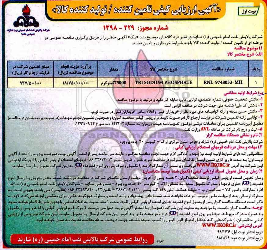 | RNL-9748033-MH | TRI SODIUM PHOSPHATE | 75000 کیلوگرم | 18.750.000.000 | 937.500.000 |
