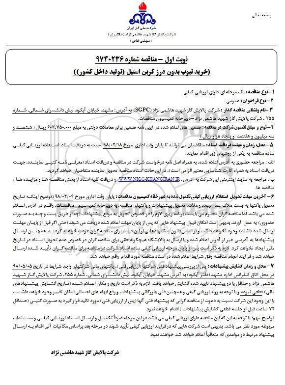 7- محل و زمان گشایش پیشنهادات: پس از بررسی پیشنهاد فنی شرکتها ارزیابی فنی پاکتهای مالی شرکتهای واجد شرایط در تاریخ 98.5.5در محل اتاق کنفرانس اداره مشهد (دفتر آبکوه) به آدرس مشهد، خیابان آبکوه، نبش دانشسرای شمالی، شماره 255، شرکت پالایش گاز شهید هاشمی نژاد و حداقل با دو پیشنهاد تایید شده گشایش خواهد یافت لازم به ذکر است تا تاریخ و مکان اعلام شده تاریخ گشایش پیشنهادهای مالی قطعی نبوده و با توجه به روند ارزیابی فنی/ بازرگانی پیشنهادات و رفع ابهام های احتمالی امکان تغییر وجود خواهد داشت با این وجود این شرکت نسبت به دعوت از مناقصه گرانی که پیشنهاد فنی آنها پس از ارزیابی فنی مورد تایید قرار گیرد به صورت کتبی حداقل 72 ساعت قبل از جلسه قطعی گشایش پیشنهادات اقدام خواهد نمود