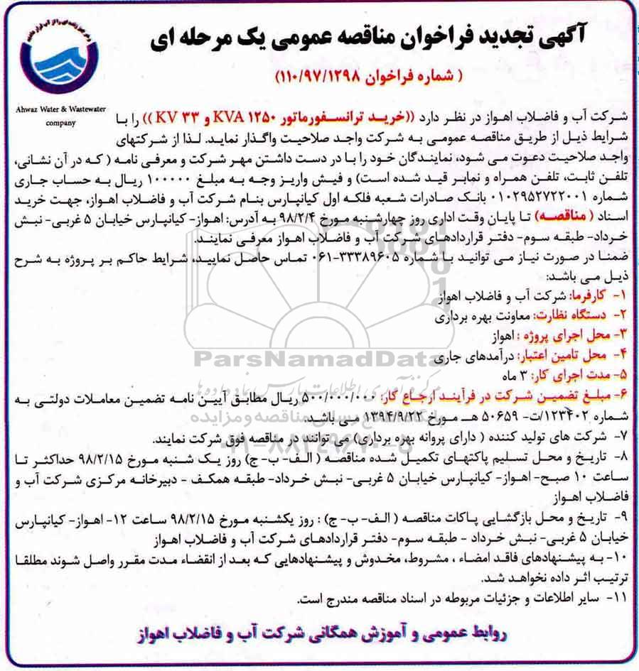 شرکت آب و فاضلاب اهواز در نظر دارد خرید ترانسفورماتور KVA 1250 و KV 33 را با شرایط ذیل از طریق مناقصه عمومی به شرکت واجد صلاحیت واگذار نماید لذا از شرکت های واجد صلاحیت دعوت می شود نمایندگان خود را با در دست داشتن مهر شرکت و معرفی نامه که در آن نشانی تلفن ثابت، تلفن همراه و نمابر قید شده است و فی واریز وجه به مبلغ 100000 ریال به حساب جاری شماره 0102952722001 بانک صادرات شعبه فلکه اول کیانپارس بنام شرکت آب و فاضلاب اهواز، کیانپارش خیابان 5 غربی، نبش خرداد، طبقه سوم، دفتر قراردادهای شرکت آب و فاضلاب اهواز معرفی نمایند