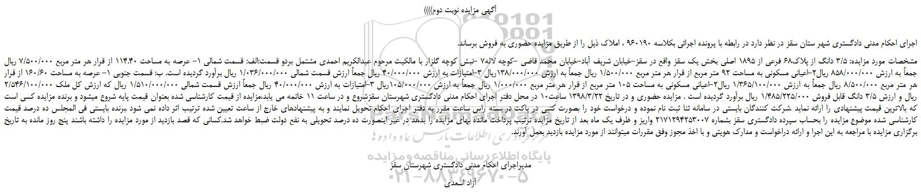 اجرای احکام مدنی دادگستری شهر ستان سقز در نظر دارد در رابطه با پرونده اجرائی بكلاسه 960190 ، املاک ذیل را از طریق مزایده حضوری به فروش برساند.