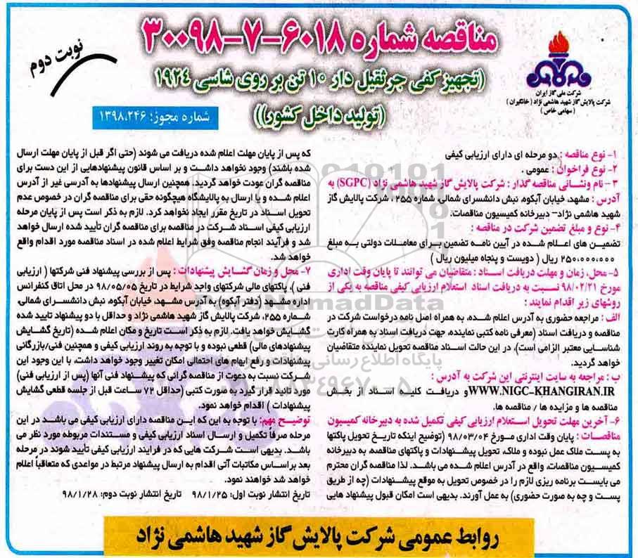 7- محل و زمان گشایش پیشنهادات: پس از بررسی پیشنهاد فنی شرکتها (ارزیابی فنی) پاکتهای مالی شرکتهای واجد شرایط در تاریخ 98.5.5 در محل اتاق کنفرانس اداره مشهد دفتر آبکوه به آدرس مشهد خیابان آبکوه نبش دانشسرای شمالی شماره 255 شرکت پالایش گاز شهید هاشمی نژاد و حداقل با دو پیشنهاد تایید شده گشایش خواهد یافت. لازم به ذکر است تا تاریخ و مکان اعلام شده تاریخ گشایش پیشنهادهای مالی قطعی نبوده و با توجه به روند ارزیابی کیفی و همچنین فنی بازرگانی پیشنهادات و رفع ابهام های احتمالی امکان تغییر وجود خواهد داشت با این وجود این شرکت نسبت به دعوت از مناقصه گرانی که پیشنهاد فنی آنها پس از ارزیابی فنی مورد تایید قرار گیرد به صورت کتبی حداقل 72 ساعت قبل از جلسه قطعی گشایش پیشنهادات اقدام خواهد نمود