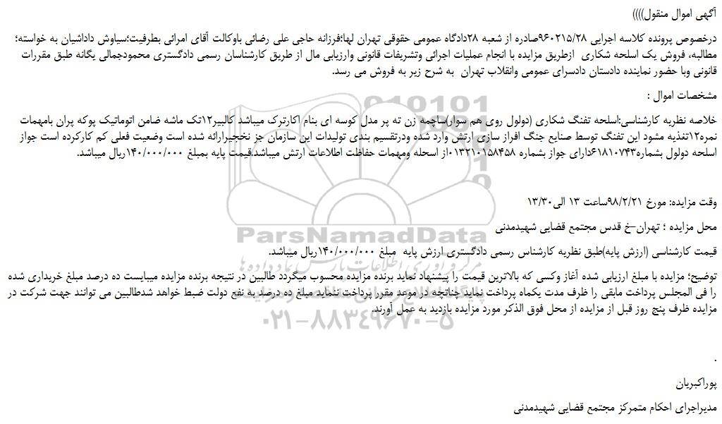 درخصوص پرونده کلاسه اجرایی 960215.28صادره از شعبه 28دادگاه عمومی حقوقی تهران لها؛فرزانه حاجی علی رضائی باوکالت آقای امرائی بطرفیت؛سیاوش داداشیان به خواسته؛ مطالبه، فروش یک اسلحه شکاری ازطریق مزایده با انجام عملیات اجرائی وتشریفات قانونی وارزیابی مال از طریق کارشناسان رسمی دادگستری محمودجمالی یگانه طبق مقررات قانونی وبا حضور نماینده دادستان دادسرای عمومی وانقلاب تهران به شرح زیر به فروش می رسد.