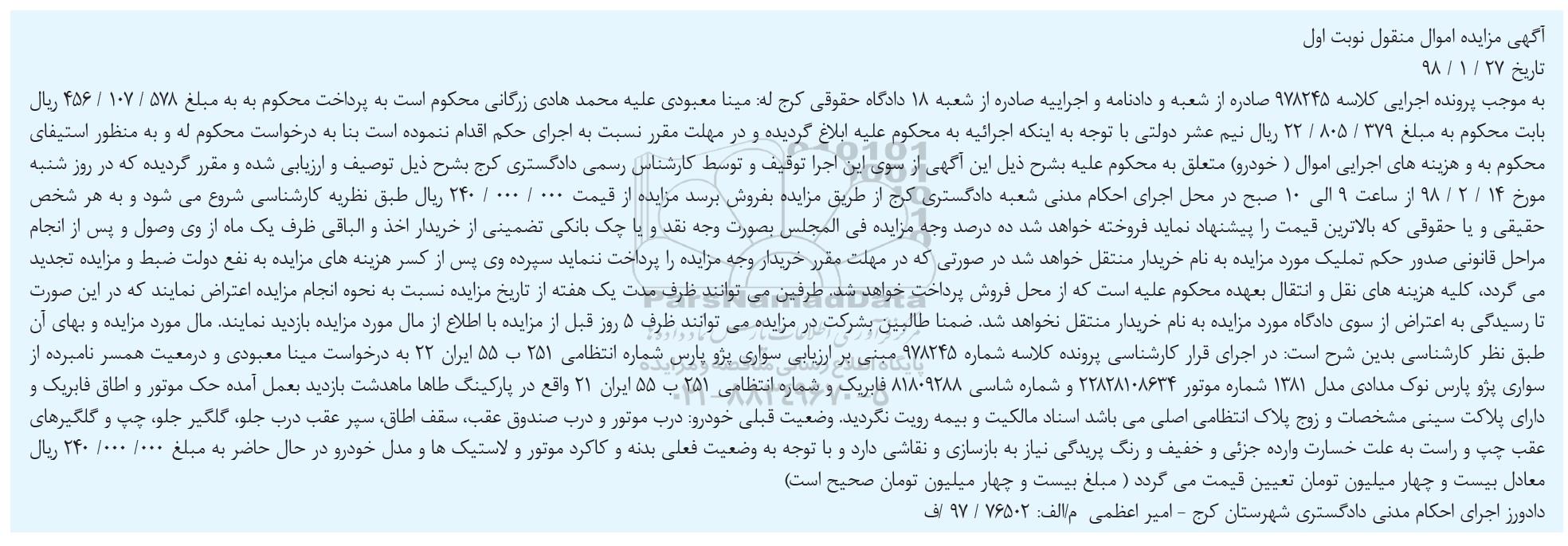 مزایده: سواری پژو پارس نوک مدادی مدل 1381 به ارزش 240.000.000 ریال معادل بیست و چهار میلیون تومان