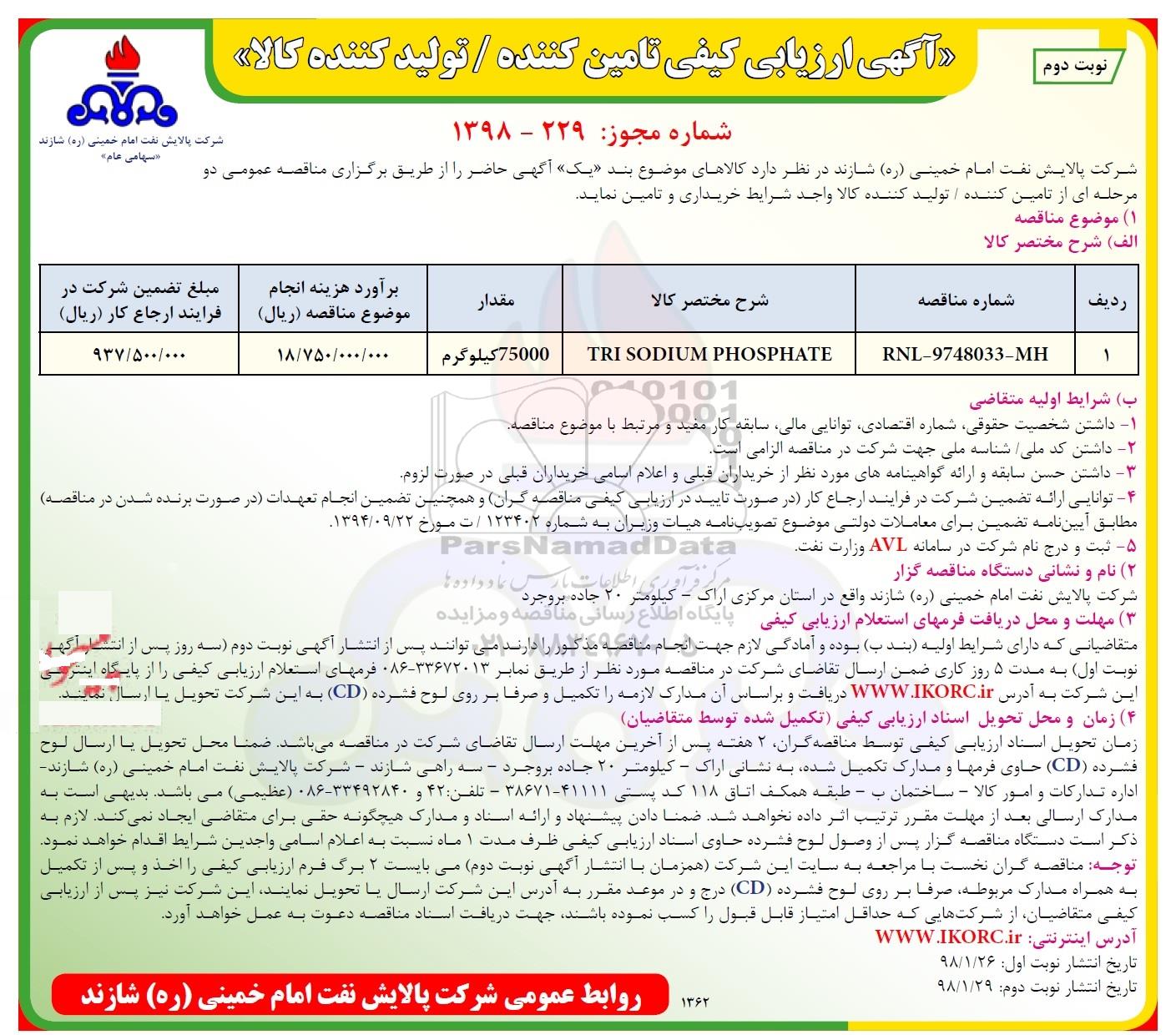 آگهی ارزیابی کیفی TRI SODIUM PHOSPHATE - نوبت دوم از کلیه افراد متخصص و شرکتها واجد شرایط دعوت به عمل میآید در مناقصه با کد خبرگزاری پارس نماد: 1596986 شرکت نمایند.