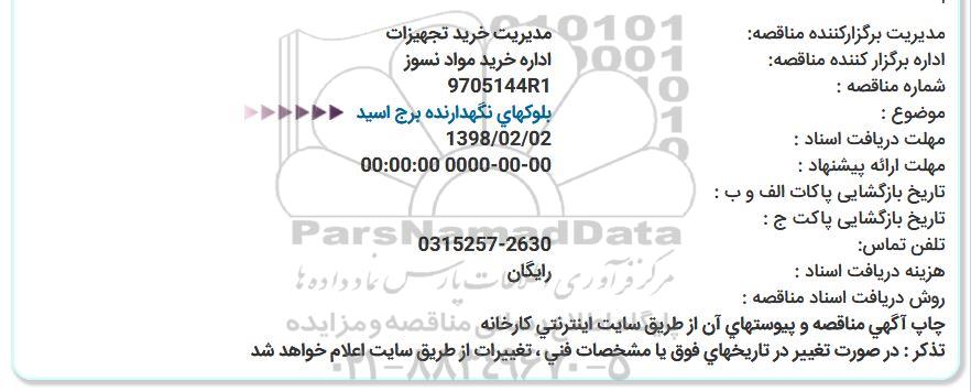 علاقهمندان میتوانند جهت دریافت اسناد و اطلاعات تکمیلی، مناقصه بلوكهای نگهدارنده برج اسید با سامانه مناقصات و مزایدات ایران پارسنماد داده ها 88349670 تماس حاصل نمایند.