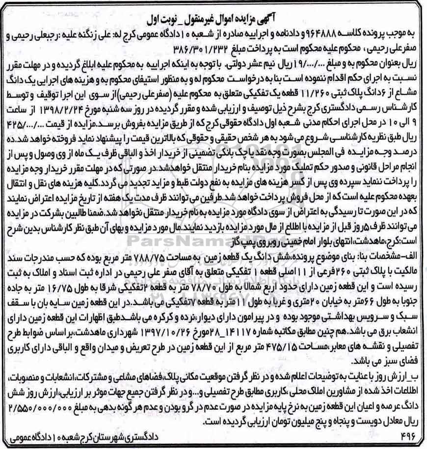 مزایده یک دانگ مشاع از 6 دانگ پلاک ثبتی کلاسه 964888 نوبت اول
