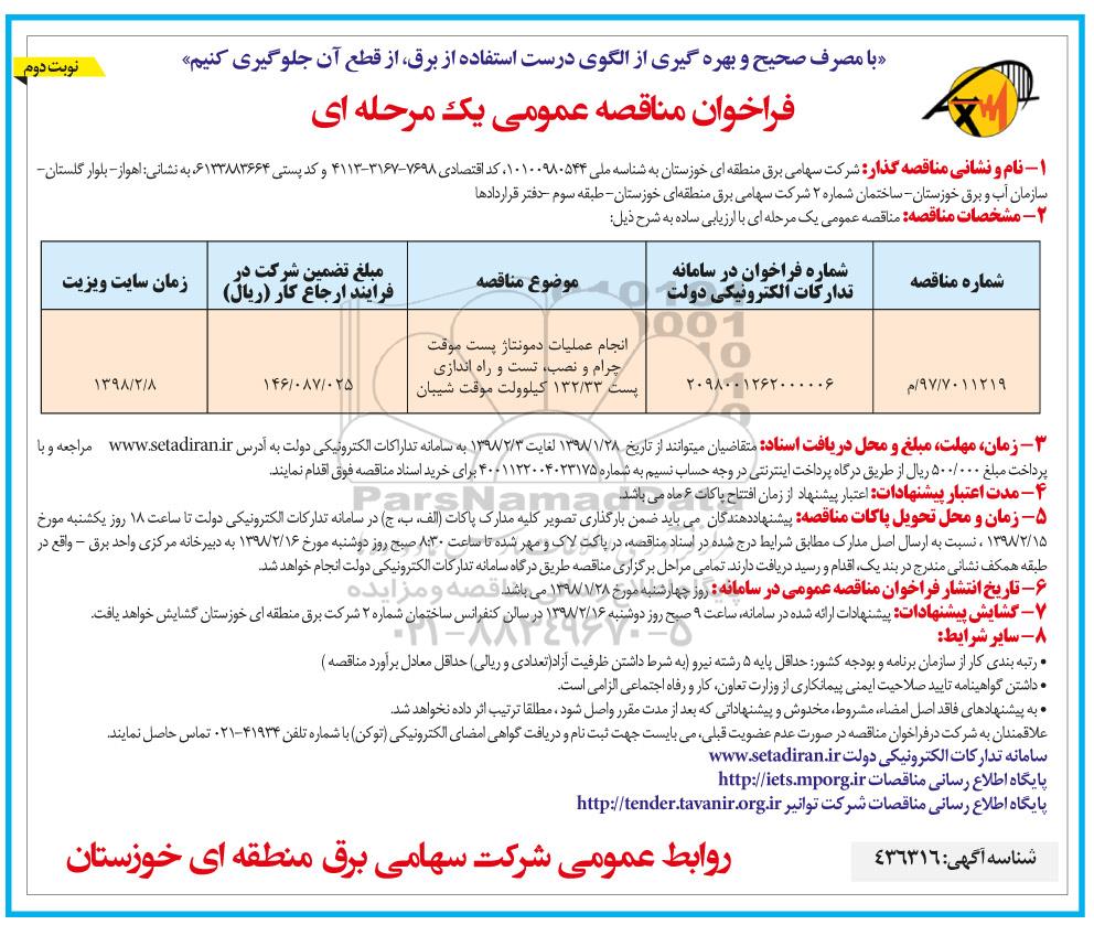مناقصه انجام عملیات دمونتاژ پست برق ...نوبت دوم از کلیه افراد متخصص و شرکتها واجد شرایط دعوت به عمل میآید در مناقصه با کد خبرگزاری پارس نماد: 1601076 شرکت نمایند.