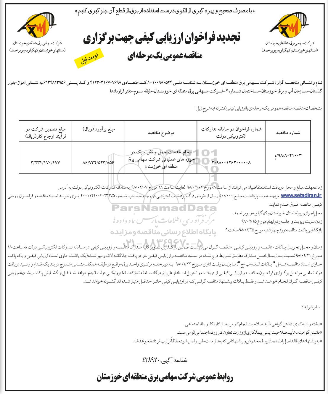 98/8014003/م 2098001262000008 انجام خدمات حمل و نقل  سبک در حوزه های عملیاتی شرکت سهامی برق منطقه ای خوزستان