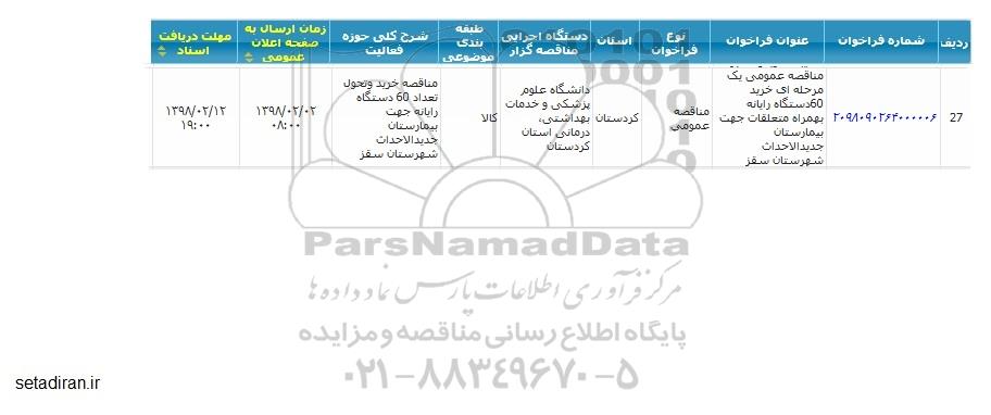 عنوان فراخوان : مناقصه عمومی یک مرحله ای خرید 60 دستگاه رایانه بهمراه متعلقات جهت بیمارستان جدید الاحداث شهرستان سقز