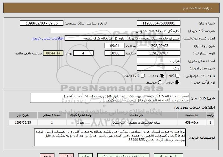 شرح کلی نیاز: تعمیرات کتابخانه های عمومی شهرستان ساوه طبق فایل پیوست (ساخت درب آهنی) مبالغ نیز جداگانه و به تفکیک در فایل پیوست ارسال گردد