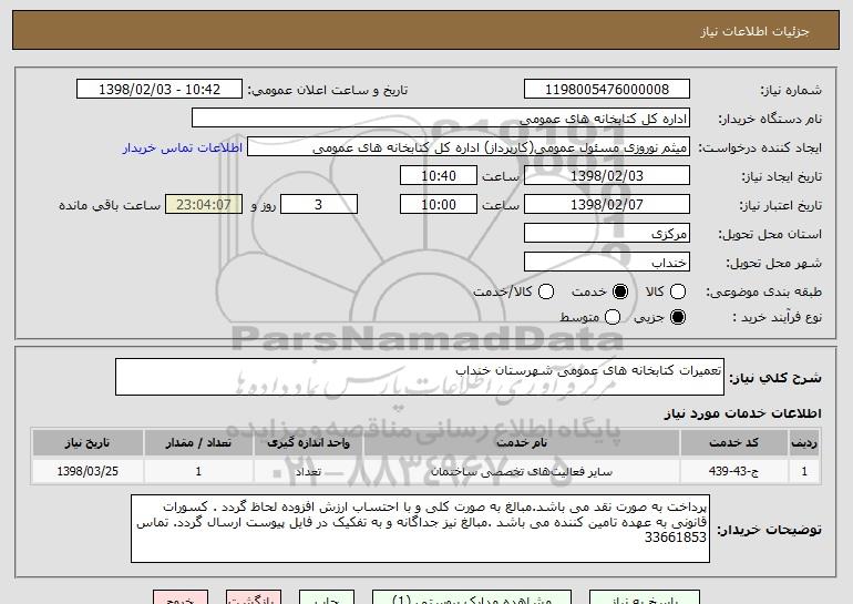 شرح کلی نیاز: تعمیرات کتابخانه های عمومی شهرستان خنداب