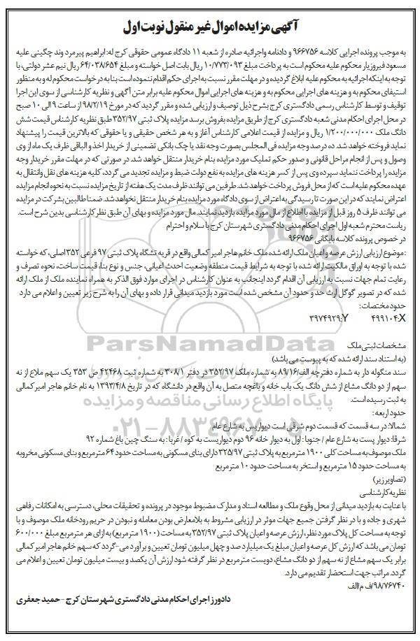 مزایده پلاک ثبتی 97 فرعی 352 اصلی نوبت اول کلاسه 966756