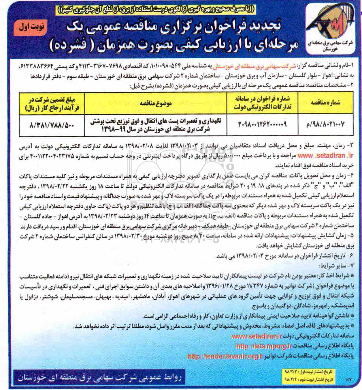 98/8021007/م 2098001262000009 نگهداری و تعمیرات پست های انتقال و فوق توزیع تحت پوشش شرکت برق منطقه ای خوزستان در سال 99-1398