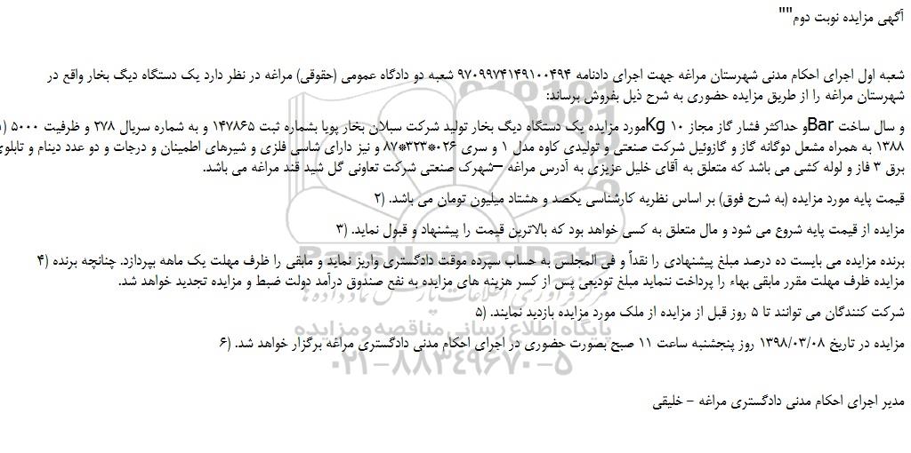 شعبه اول اجرای احکام مدنی شهرستان مراغه جهت اجرای دادنامه 9709974149100494 شعبه دو دادگاه عمومی (حقوقی) مراغه در نظر دارد یک دستگاه دیگ بخار واقع در شهرستان مراغه را از طریق مزایده حضوری به شرح ذیل بفروش برساند: