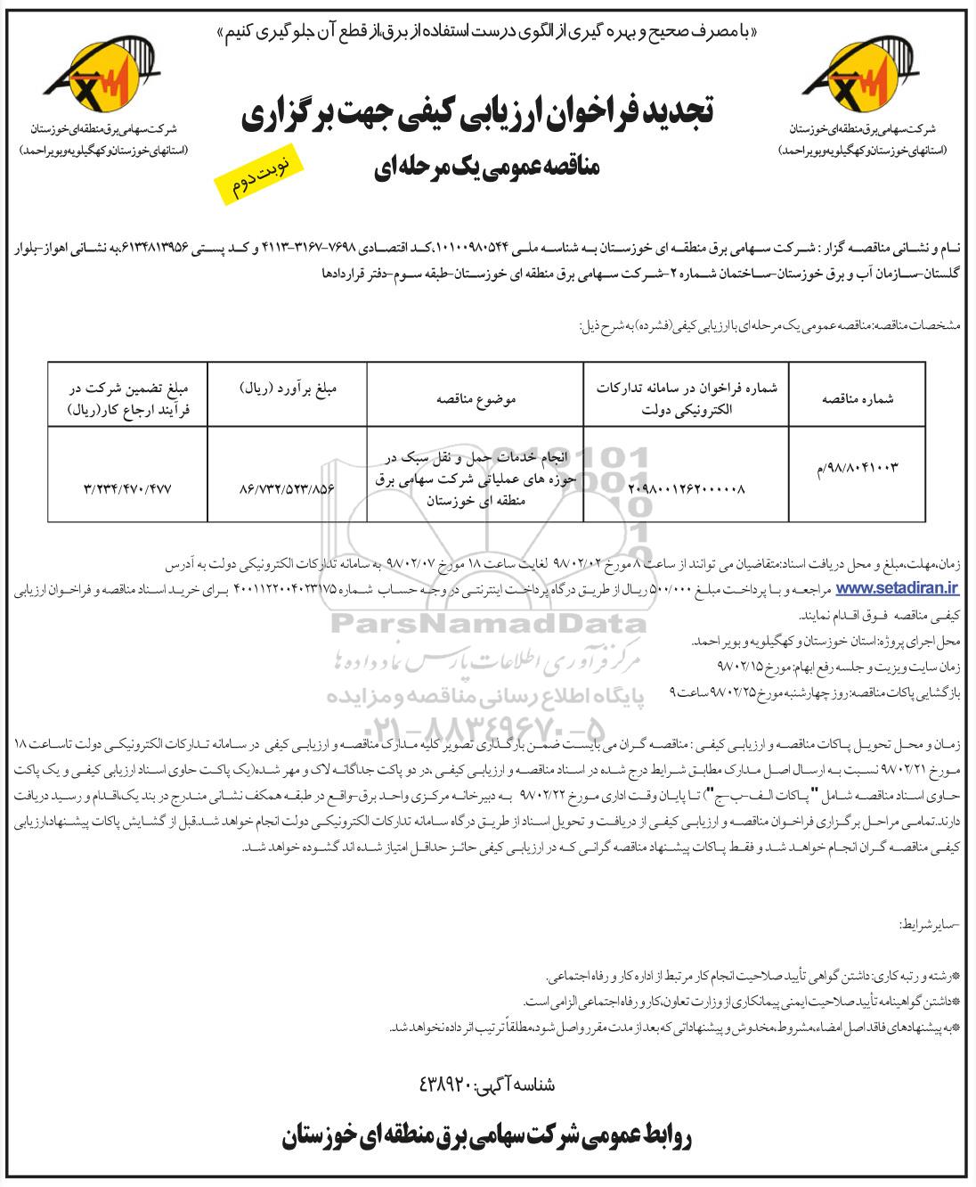 | 98/8014003/م | 2098001262000008 | انجام خدمات حمل و نقل سبک در حوزه های عملیاتی شرکت سهامی برق منطقه ای خوزستان |