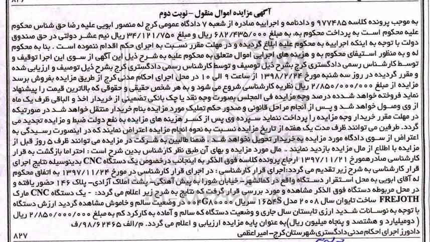 زمان و مکان مزایده: روز سه شنبه مورخ 1398.02.24 از ساعت 9 الی 10 در محل اجرای احکام مدنی کرج