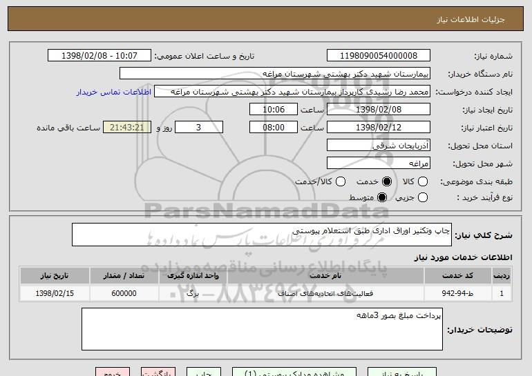 شرح کلی نیاز: چاپ وتکثیر اوراق اداری طبق استعلام پیوستی