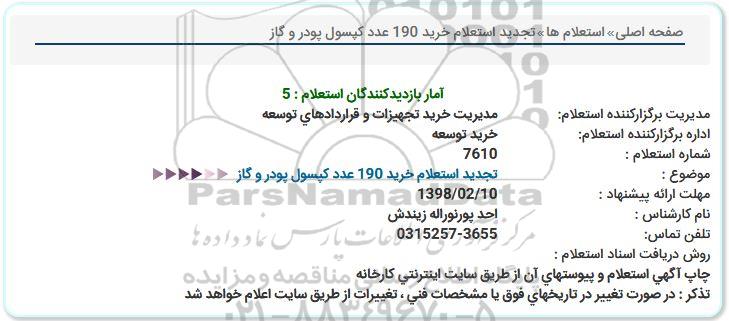 موضوع : تجدید استعلام خرید 190 عدد کپسول پودر و گاز