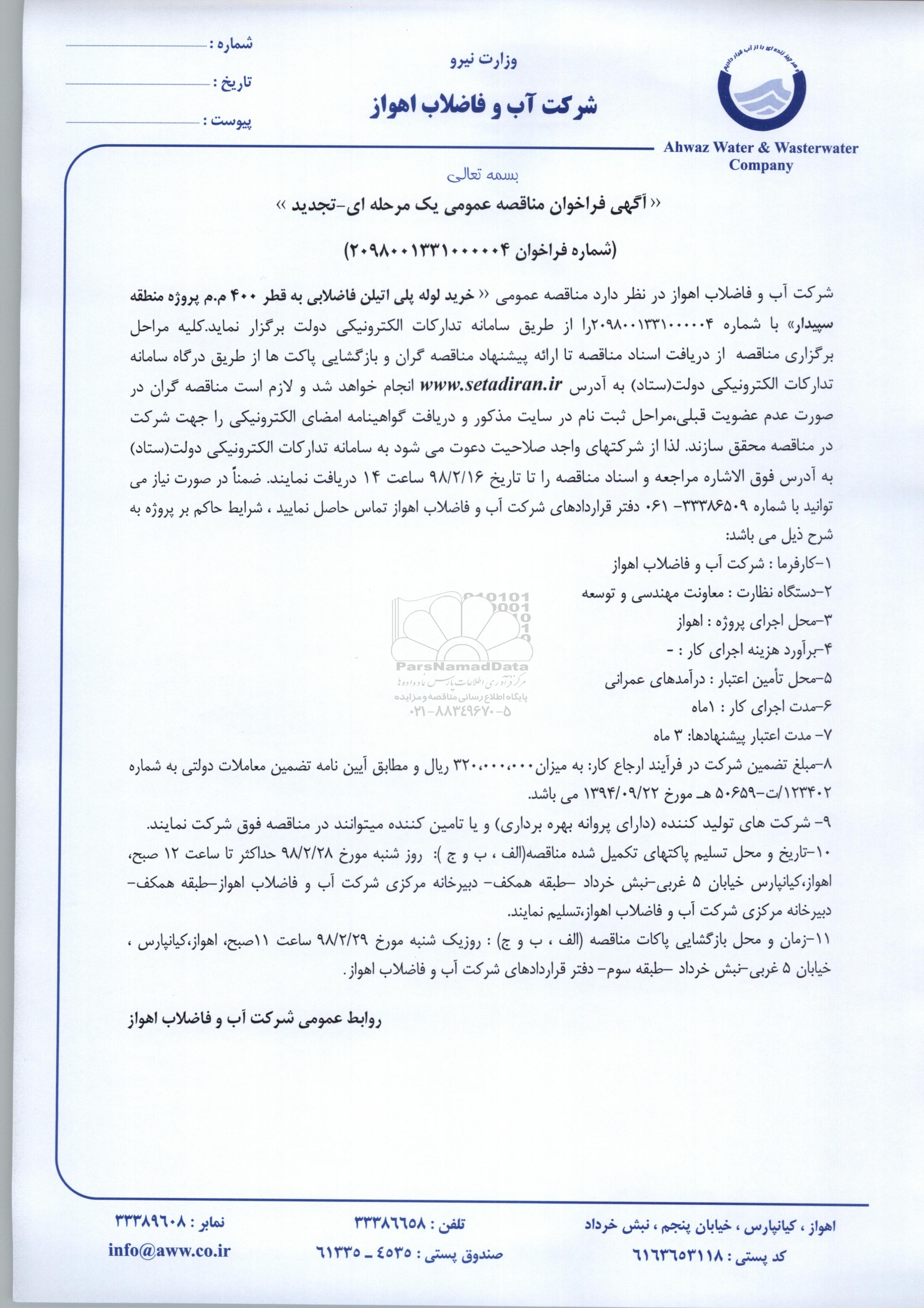 شرکت آب و فاضلاب اهواز در نظر دارد‹‹ خرید لوله پلی اتیلن فاضلابی به قطر 400 م.م پروژه منطقه سپیدار با شماره 2098001331000004  را از طریق سامانه تدارکات الکترونیک دولت برگزار نماید. کلیه مراحل برگزاری مناقصه از دریافت اسناد مناقصه تا ارائه پیشنهاد مناقصه گران و بازگشایی پاکتها از طریق درگاه سامانه تدارکات الکترونیک دولت به ادرس  www.setadiran.ir انجام خواهد شد و لازم است مناقصه گران در صورت عدم عضویت قبلی مراحل ثبت نام و در سایت مذور و دریافت گواهینامه امضای الکترونیکی را جهت شرکت در مناقص محقق سازند لذا شرکتهای واجد صلاحیت دعوت میشود به سامانه تدارکات الکترونیکی دولت ستاد به ادرس فوق الاشاره مراجع ن و اسناد مناقصه را تا تاریخ 98.2.16 ساعت 14 دریافت نمایند ضمنا در صورت نیاز بم توایند با شماره 33386509-061 دفتر قراردادهای شرکت آب و فاضلاب اهواز تماس حاصل نمایند شرایط حاکم بر پروژه به شرح ذیل میباشد