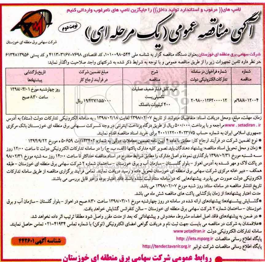 شرکت سهامی برق منطقه ای خوزستان به عنوان دستگاه مناقصه گزار به شناسه ملی 10100980544 ، کد اقتصادی 7698-3167-4113 و کدپستی 6134813956 در نظر دارد تامین تجهیزات زیر را از طریق مناقصه عمومی و با توجه به شرایط ذکر شده به شرکتهای واجد صلاحیت واگذار نماید: