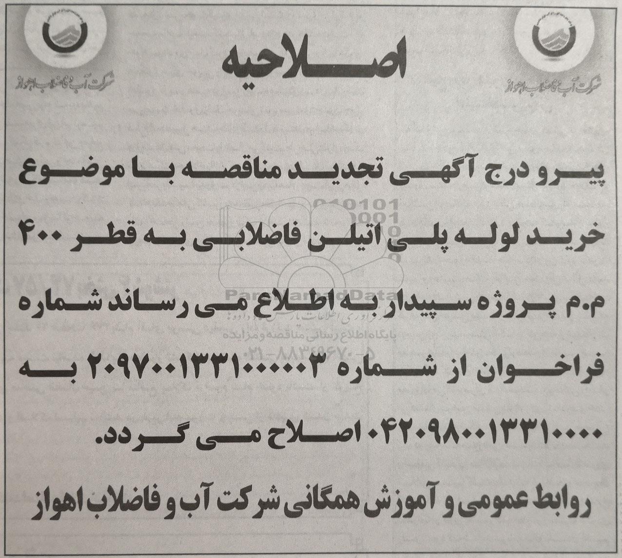 پیرو درج اگهی تجدید مناقصه با موضوع خرید لوله پلی اتیلن فاضلابی به قطر 400 م.م پروژه سپیدار با اطلاع می رساند شماره فراخوان از شماره 2097001331000003 به 10420980013310000 اصلاح میگردد