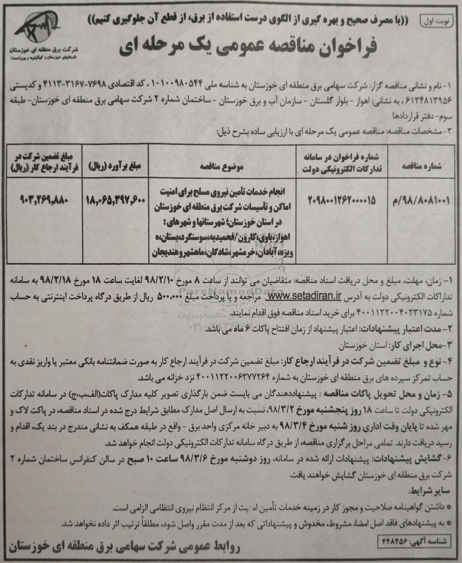 | 98/8081001/م | 2098001262000015 | انجام خدمات تامین نیروی مسلح برای امنیت اماکن و تاسیسات شرکت برق منطقه ای خوزستان در دو استان خوزستان در استان خوزستان ; شهرستانها و شهرهای: اهواز ، باوی ، کارون - فحمیدیه ، سوسنگرد ،بستان ، هویزه ، آبادان ، خرمشهر ، شادگان ، ماهشهر و هندیجان |