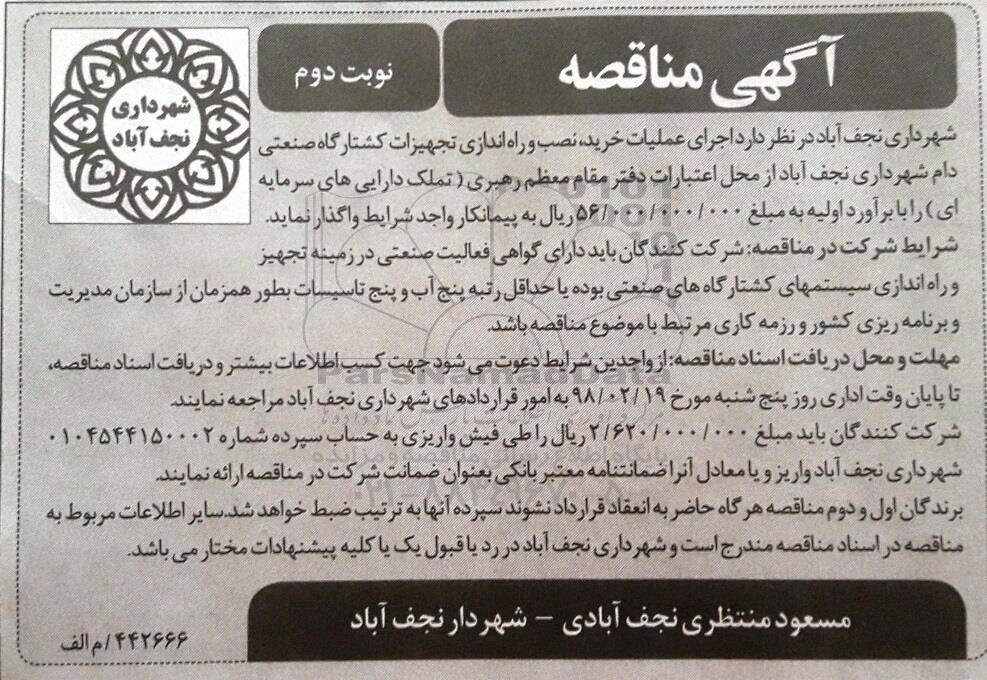 شهرداری نجف آباد در نظر دارد اجرای عملیات خرید، نصب و راه اندازی تجهیزات کشتارگاه صنعتی دام شهرداری نجف آباد از محل اعتبارات دفتر مقام معظم رهبری (تملک دارایی های سرمایه ای) را با برآورد اولیه به مبلغ 56.000.000.000 ریال به پیمانکار واجد شرایط واگذار نماید.