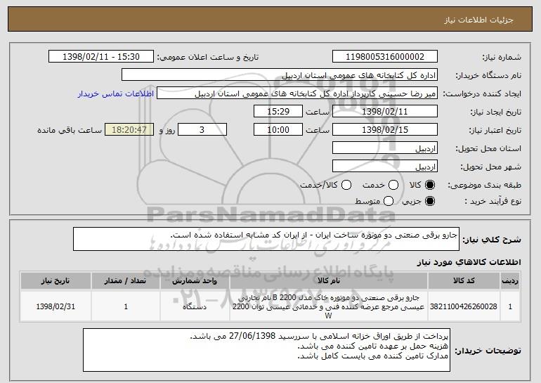 شرح کلی نیاز: جارو برقی صنعتی دو موتوره ساخت ایران - از ایران کد مشابه استفاده شده است.