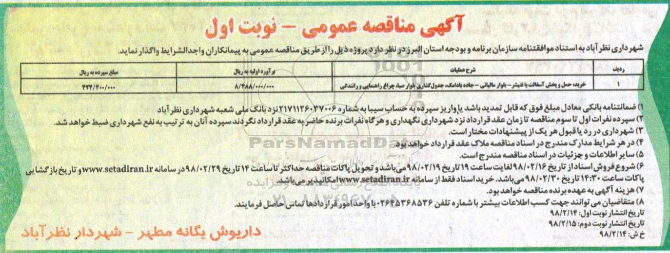 شهرداری نظرآباد در نظر دارد پروژه ذیل را از طریق مناقصه عمومی به پیمانکاران واجد الشرایط واگذار نماید.