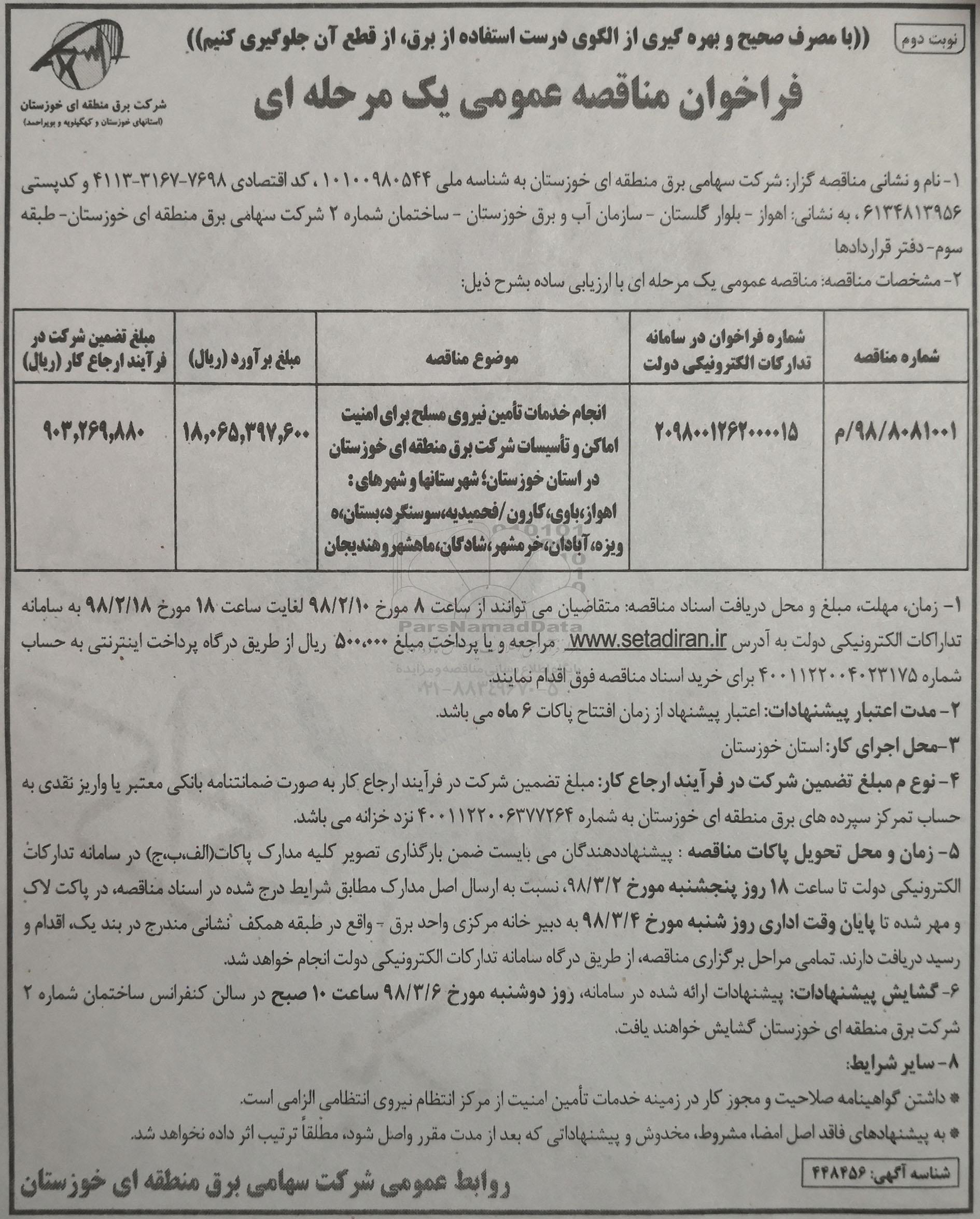| 98/8081001/م | 2098001262000015 | انجام خدمات تامین نیروی مسلح برای امنیت اماکن و تاسیسات شرکت برق منطقه ای خوزستان در دو استان خوزستان در استان خوزستان ; شهرستانها و شهرهای: اهواز ، باوی ، کارون - فحمیدیه ، سوسنگرد ،بستان ، هویزه ، آبادان ، خرمشهر ، شادگان ، ماهشهر و هندیجان |