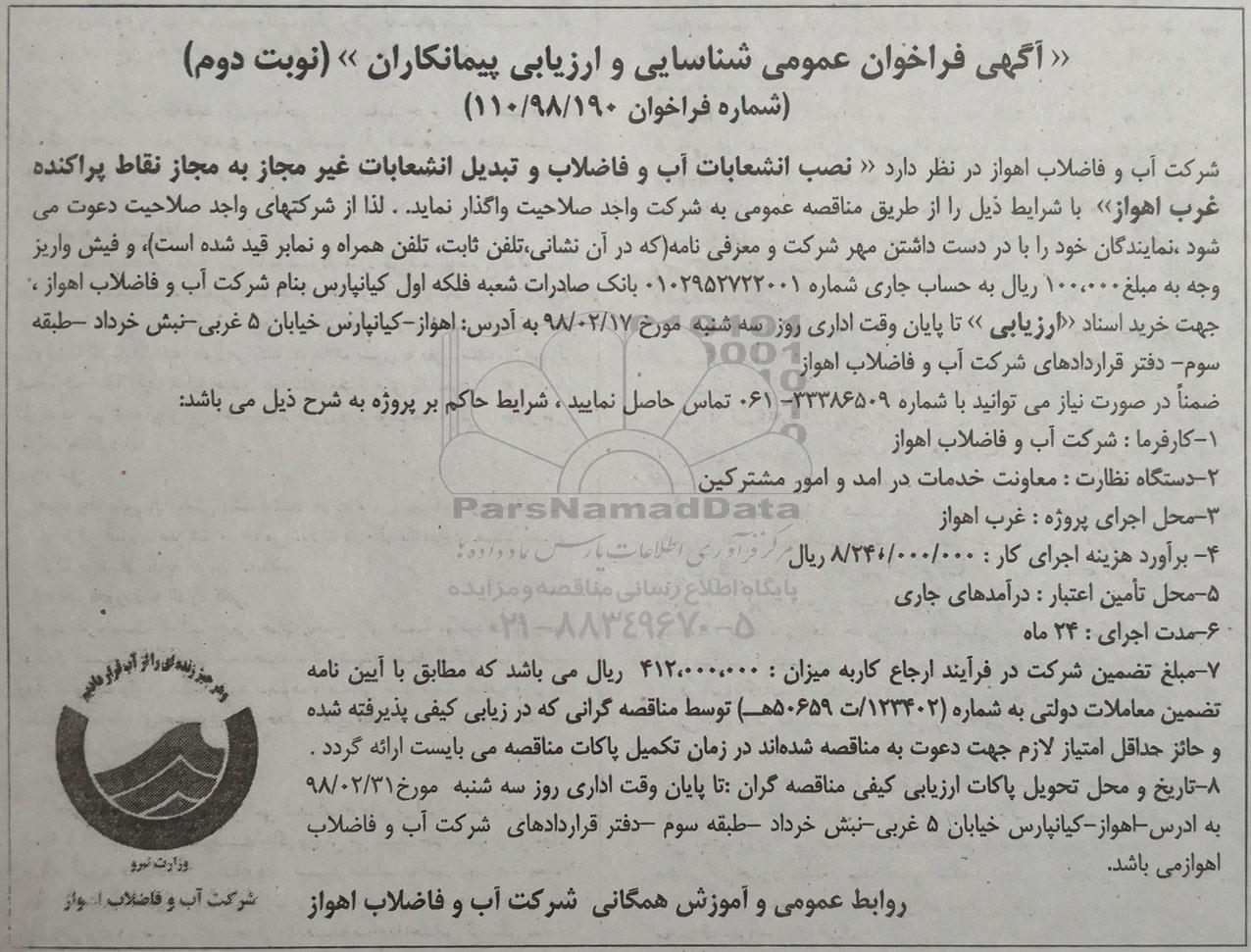 شرکت آب و فاضلاب اهواز در نظر دارد پروژه ‹‹ نصب انشعابات آب و فاضلاب و تبدیل انشعابات غیرمجاز به مجاز نقاط پراکنده غرب اهواز›› را با شرایط ذیل از طریق مناقصه عمومی به شرکت واجد صلاحیت واگذار نماید. لذا از شرکتهای واجد صلاحیت دعوت می شود ، نمایندگان خود را با در دست داشتن مهر شرکت و معرفی نامه(که در آن نشانی،تلفن ثابت، تلفن همراه و نمابر قید شده است)، و فیش واریز وجه به مبلغ ۱۰۰،۰۰۰ریال به حساب جاری شماره ۰۱۰۲۹۵۲۷۲۲۰۰۱ بانک صادرات شعبه فلکه اول کیانپارس بنام شرکت آب و فاضلاب اهواز ، جهت خرید اسناد ‹‹ارزیابی ›› تا پایان وقت اداری روز سه شنبه 98.2.17 به آدرس زیر:
