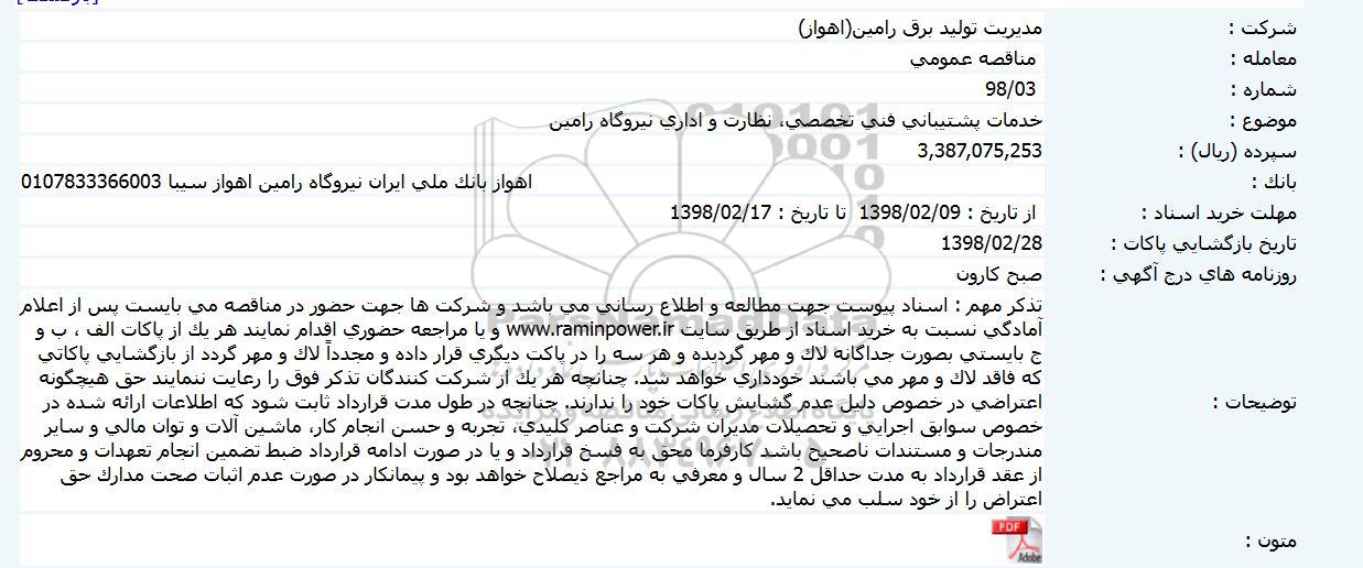 موضوع: خدمات پشتیبانی فنی تخصصی نظارت و اداری نیروگاه رامین