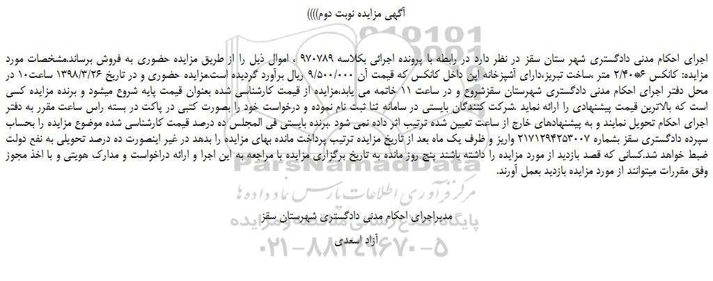 اجرای احکام مدنی دادگستری شهر ستان سقز در نظر دارد در رابطه با پرونده اجرائی بكلاسه 970789 ، اموال ذیل را از طریق مزایده حضوری به فروش برساند.مشخصات مورد مزایده: کانکس 6*2.40 متر ،ساخت تبریز،دارای آشپزخانه اپن داخل کانکس که قیمت آن 9.500.000 ریال برآورد گردیده است.مزایده حضوری و در تاریخ 1398.3.26 ساعت10 در محل دفتر اجرای احکام مدنی دادگستری شهرستان سقزشروع و در ساعت 11 خاتمه می یابد،مزایده از قیمت کارشناسی شده بعنوان قیمت پایه شروع میشود و برنده مزایده کسی است که بالاترین قیمت پیشنهادی را ارائه نماید .شرکت کنندگان بایستی در سامانه ثنا ثبت نام نموده و درخواست خود را بصورت کتبی در پاکت در بسته راس ساعت مقرر به دفتر اجرای احکام تحویل نمایند و به پیشنهادهای خارج از ساعت تعیین شده ترتیب اثر داده نمی شود .برنده بایستی فی المجلس ده درصد قیمت کارشناسی شده موضوع مزایده را بحساب سپرده دادگستری سقز بشماره 2171294253007 واریز و ظرف یک ماه بعد از تاریخ مزایده ترتیب پرداخت مانده بهای مزایده را بدهد در غیر اینصورت ده درصد تحویلی به نفع دولت ضبط خواهد شد.کسانی که قصد بازدید از مورد مزایده را داشته باشند پنج روز مانده به تاریخ برگزاری مزایده با مراجعه به این اجرا و ارائه دراخواست و مدارک هویتی و با اخذ مجوز وفق مقررات میتوانند از مورد مزایده بازدید بعمل آورند.
