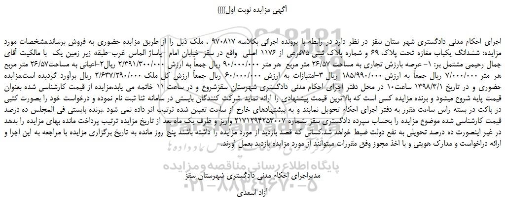 اجرای احکام مدنی دادگستری شهر ستان سقز در نظر دارد در رابطه با پرونده اجرائی بكلاسه 970817 ، ملک ذیل را از طریق مزایده حضوری به فروش برساند.مشخصات مورد مزایده: ششدانگ یکباب مغازه تحت پلاک 69 و شماره پلاک ثبتی 75فرعی از 1176 اصلی واقع در سقز-خیابان امام -پاساژ الماس غرب-طبقه زیر زمین یک با مالکیت آقای جمال رحیمی مشتمل بر: 1- عرصه بارزش تجاری به مساحت 26.57 متر مربع هر متر 90.000.000 ریال جمعاً به ارزش 2.391.300.000 ریال2-اعیانی به مساحت26.57 متر مربع هر متر 7.000.000 ریال جمعاً به ارزش 185.990.000 ریال 3-امتیازات به ارزش 60.000.000 ریال جمعاً ارزش کل ملک 2.637.290.000 ریال برآورد گردیده است.مزایده حضوری و در تاریخ 1398.3.1 ساعت10 در محل دفتر اجرای احکام مدنی دادگستری شهرستان سقزشروع و در ساعت 11 خاتمه می یابد،مزایده از قیمت کارشناسی شده بعنوان قیمت پایه شروع میشود و برنده مزایده کسی است که بالاترین قیمت پیشنهادی را ارائه نماید .شرکت کنندگان بایستی در سامانه ثنا ثبت نام نموده و درخواست خود را بصورت کتبی در پاکت در بسته راس ساعت مقرر به دفتر اجرای احکام تحویل نمایند و به پیشنهادهای خارج از ساعت تعیین شده ترتیب اثر داده نمی شود .برنده بایستی فی المجلس ده درصد قیمت کارشناسی شده موضوع مزایده را بحساب سپرده دادگستری سقز بشماره 2171294253007 واریز و ظرف یک ماه بعد از تاریخ مزایده ترتیب پرداخت مانده بهای مزایده را بدهد در غیر اینصورت ده درصد تحویلی به نفع دولت ضبط خواهد شد.کسانی که قصد بازدید از مورد مزایده را داشته باشند پنج روز مانده به تاریخ برگزاری مزایده با مراجعه به این اجرا و ارائه دراخواست و مدارک هویتی و با اخذ مجوز وفق مقررات میتوانند از مورد مزایده بازدید بعمل آورند.