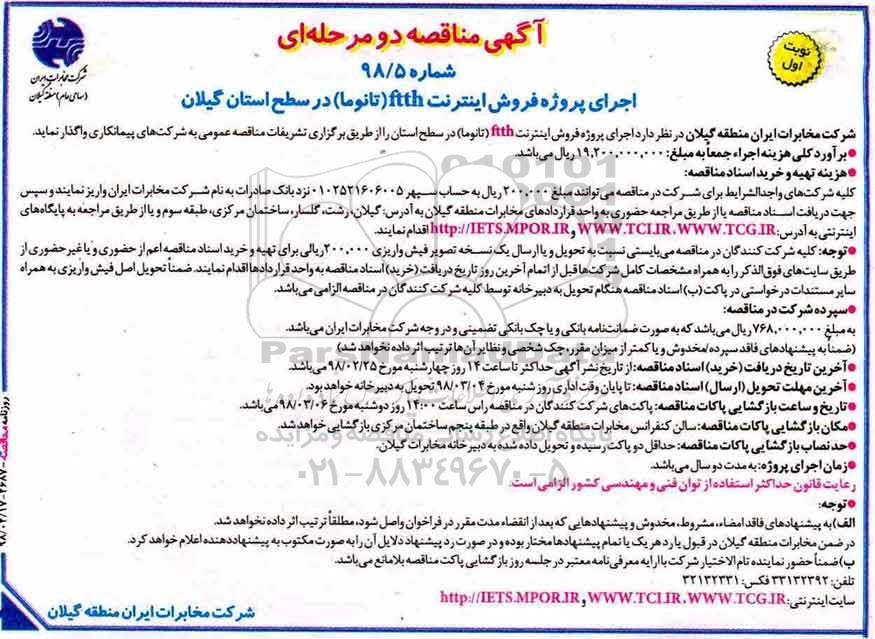 شرکت مخابرات ایران منطقه گیلان درنظردارد اجرای پروژه فروش اینترنت ftth ( تانوما ) در سطح استان را ازطریق برگزاری تشریفات مناقصه عمومی به شرکتهای پیمانکاران واگذار نماید