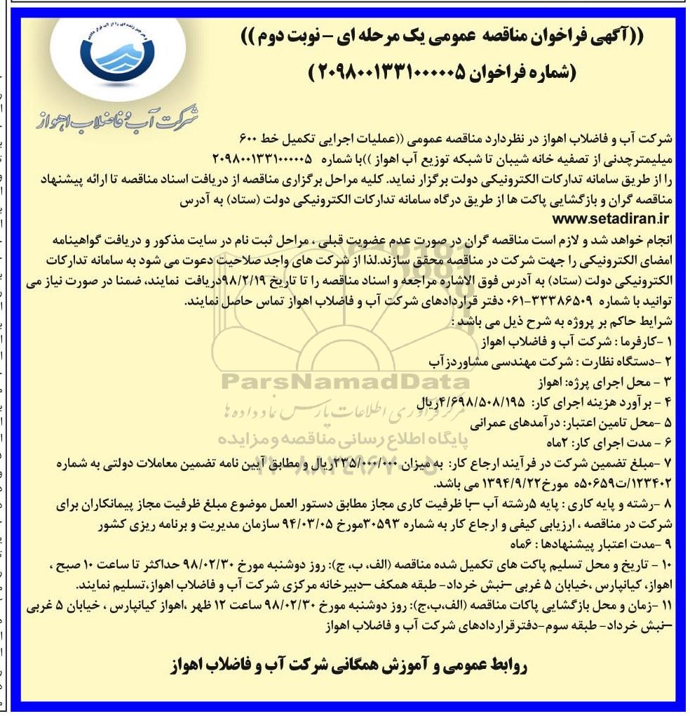 شرکت آب و فاضلاب اهواز در نظر دارد مناقصه عمومی عملیات اجرایی تکمیل خط 600 میلیمتر چدنی از تصفیه خانه شیبان تا شبکه توزیع آب اهواز با شماره 2098001331000005