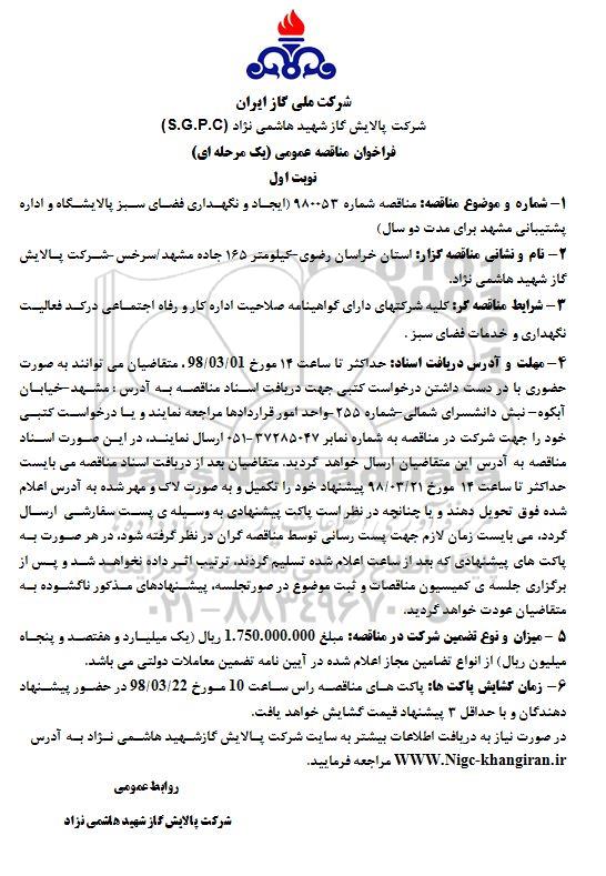 1- شماره و موضوع مناقصه: مناقصه شماره 980053 (ایجاد و نگهداری فضای سبز پالایشگاه و اداره پشتیبانی مشهد برای مدت دو سال )