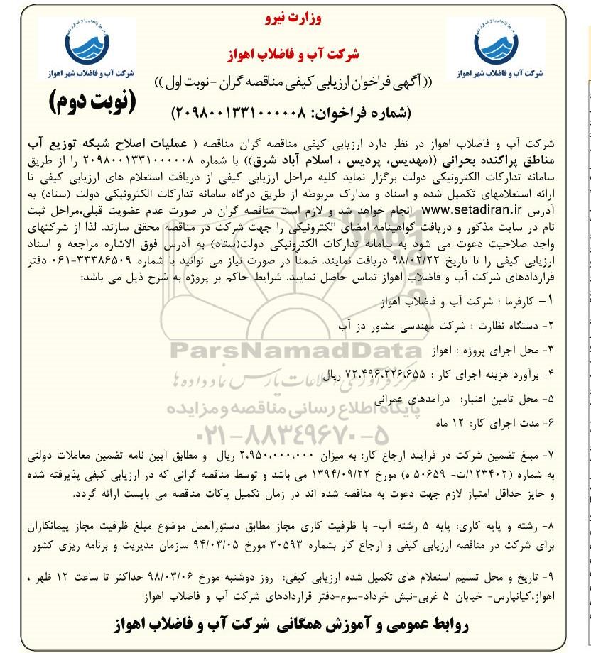 شرکت آب وفاضلاب اهواز در نظر دارد ارزیابی کیفی مناقصه گران عملیات اصلاح شبکه توزیع آب مناطق پراکنده بحرانی مهدیس ـ پردیس ـ اسلام آباد شرق با شماره 2098001331000008 را از طریق سامانه تدارکات الکترونیکی دولت برگزار نماید. کلیه مراحل ارزیابی کیفی از دریافت استعلام های ارزیابی کیفی تا ارائه استعلام های تکمیل شده و اسناد و مدارک مربوطه از طریق درگاه سامانه تدارکات الکترونیکی دولت ستاد به آدرس ستاد انجام خواهد شد و لازم است مناقصه گران در صورت عدم عضویت قبلی مراحل ثبت نام در سایت مذکور و دریافت گواهینامه امضای الکترونیکی را جهت شرکت در مناقصه محقق سازن. لذا از شرکت های واجد صلاحیت دعوت می شود به سامانه تدارکات الکترونیکی دولت ستاد به آدرس فوق الاشاره مراجعه و اسناد مناقصه را تا تاریخ 98.2.22 دریافت نمایند. ضمنا در صورت نیاز می توانید با شماره 061- 33386509 دفتر قراردادهای شرکت آب وفاضلاب اهواز تماس حاصل نمایید. شرایط حاکم بر پروژه به شرح ذیل می ابشد.