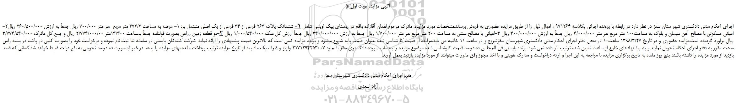 اجرای احکام مدنی دادگستری شهر ستان سقز در نظر دارد در رابطه با پرونده اجرائی بكلاسه 971264 ، اموال ذیل را از طریق مزایده حضوری به فروش برساند.مشخصات مورد مزایده: ماترک مرحوم لقمان آقازاده واقع در روستای بیگ اویسی شامل 1- ششدانگ پلاک 263 فرعی از 34 فرعی از یک اصلی مشتمل بر: 1- عرصه به مساحت 372.2 متر مربع هر متر 700.000 ریال جمعاً به ارزش 260.500.000 ریال2-اعیانی مسکونی با مصالح آهن سیمان و بلوک به مساحت100 متر مربع هر متر 4.000.000 ریال جمعاً به ارزش 400.000.000 ریال 3-اعیانی با مصالح سنتی به مساحت 200 متر مربع هر متر 1.700.000 ریال جمعاً به ارزش 340.000.000 ریال جمعاً ارزش کل ملک 1.000.540.000 ریال 2-دو قطعه زمین زراعی بصورت قولنامه جمعاً بمساحت 13.300متر 2.774.000.00 ریال و جمع کل ماترک 3.774.540.000 ریال برآورد گردیده است.مزایده حضوری و در تاریخ 1398.3.27 ساعت10 در محل دفتر اجرای احکام مدنی دادگستری شهرستان سقزشروع و در ساعت 11 خاتمه می یابد،مزایده از قیمت کارشناسی شده بعنوان قیمت پایه شروع میشود و برنده مزایده کسی است که بالاترین قیمت پیشنهادی را ارائه نماید .شرکت کنندگان بایستی در سامانه ثنا ثبت نام نموده و درخواست خود را بصورت کتبی در پاکت در بسته راس ساعت مقرر به دفتر اجرای احکام تحویل نمایند و به پیشنهادهای خارج از ساعت تعیین شده ترتیب اثر داده نمی شود .برنده بایستی فی المجلس ده درصد قیمت کارشناسی شده موضوع مزایده را بحساب سپرده دادگستری سقز بشماره 2171294253007 واریز و ظرف یک ماه بعد از تاریخ مزایده ترتیب پرداخت مانده بهای مزایده را بدهد در غیر اینصورت ده درصد تحویلی به نفع دولت ضبط خواهد شد.کسانی که قصد بازدید از مورد مزایده را داشته باشند پنج روز مانده به تاریخ برگزاری مزایده با مراجعه به این اجرا و ارائه دراخواست و مدارک هویتی و با اخذ مجوز وفق مقررات میتوانند از مورد مزایده بازدید بعمل آورند.
