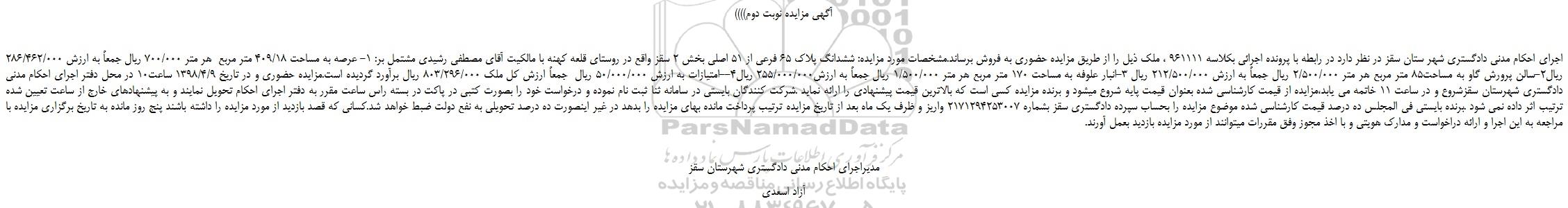 اجرای احکام مدنی دادگستری شهر ستان سقز در نظر دارد در رابطه با پرونده اجرائی بكلاسه 961111 ، ملک ذیل را از طریق مزایده حضوری به فروش برساند.مشخصات مورد مزایده: ششدانگ پلاک 65 فرعی از 51 اصلی بخش 2 سقز واقع در روستای قلعه کهنه با مالکیت آقای مصطفی رشیدی مشتمل بر: 1- عرصه به مساحت 409.18 متر مربع هر متر 700.000 ریال جمعاً به ارزش 286.462.000 ریال2-سالن پرورش گاو به مساحت85 متر مربع هر متر 2.500.000 ریال جمعاً به ارزش 212.500.000 ریال 3-انبار علوفه به مساحت 170 متر مربع هر متر 1.500.000 ریال جمعاً به ارزش255.000.000 ریال4--امتیازات به ارزش 50.000.000 ریال جمعاً ارزش کل ملک 803.296.000 ریال برآورد گردیده است.مزایده حضوری و در تاریخ 1398.4.9 ساعت10 در محل دفتر اجرای احکام مدنی دادگستری شهرستان سقزشروع و در ساعت 11 خاتمه می یابد،مزایده از قیمت کارشناسی شده بعنوان قیمت پایه شروع میشود و برنده مزایده کسی است که بالاترین قیمت پیشنهادی را ارائه نماید .شرکت کنندگان بایستی در سامانه ثنا ثبت نام نموده و درخواست خود را بصورت کتبی در پاکت در بسته راس ساعت مقرر به دفتر اجرای احکام تحویل نمایند و به پیشنهادهای خارج از ساعت تعیین شده ترتیب اثر داده نمی شود .برنده بایستی فی المجلس ده درصد قیمت کارشناسی شده موضوع مزایده را بحساب سپرده دادگستری سقز بشماره 2171294253007 واریز و ظرف یک ماه بعد از تاریخ مزایده ترتیب پرداخت مانده بهای مزایده را بدهد در غیر اینصورت ده درصد تحویلی به نفع دولت ضبط خواهد شد.کسانی که قصد بازدید از مورد مزایده را داشته باشند پنج روز مانده به تاریخ برگزاری مزایده با مراجعه به این اجرا و ارائه دراخواست و مدارک هویتی و با اخذ مجوز وفق مقررات میتوانند از مورد مزایده بازدید بعمل آورند.
