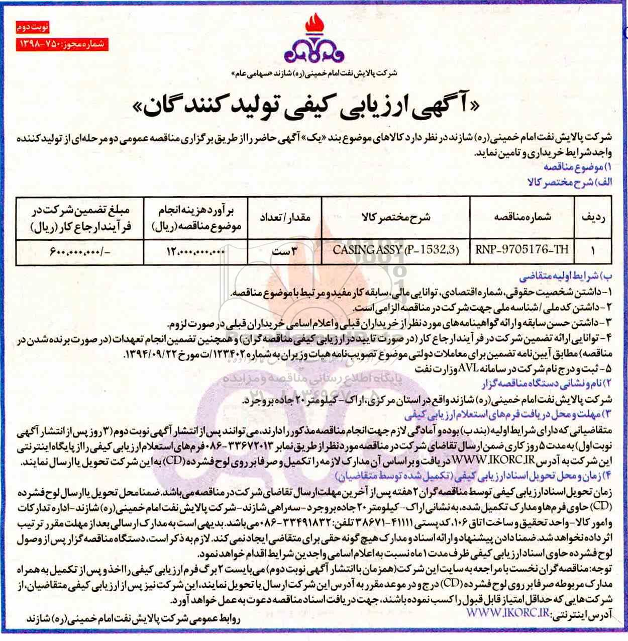 آگهی ارزیابی کیفی تولیدکنندگان CASING ASSY ... نوبت دوم از کلیه افراد متخصص و شرکتها واجد شرایط دعوت به عمل میآید در مناقصه با کد خبرگزاری پارس نماد: 1633028 شرکت نمایند.