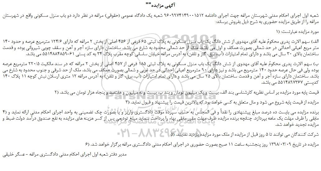 شعبه اول اجرای احکام مدنی شهرستان مراغه جهت اجرای دادنامه 9609974149001512 شعبه یک دادگاه عمومی (حقوقی) مراغه در نظر دارد دو باب منزل مسکونی واقع در شهرستان مراغه را از طریق مزایده حضوری به شرح ذیل بفروش برساند: