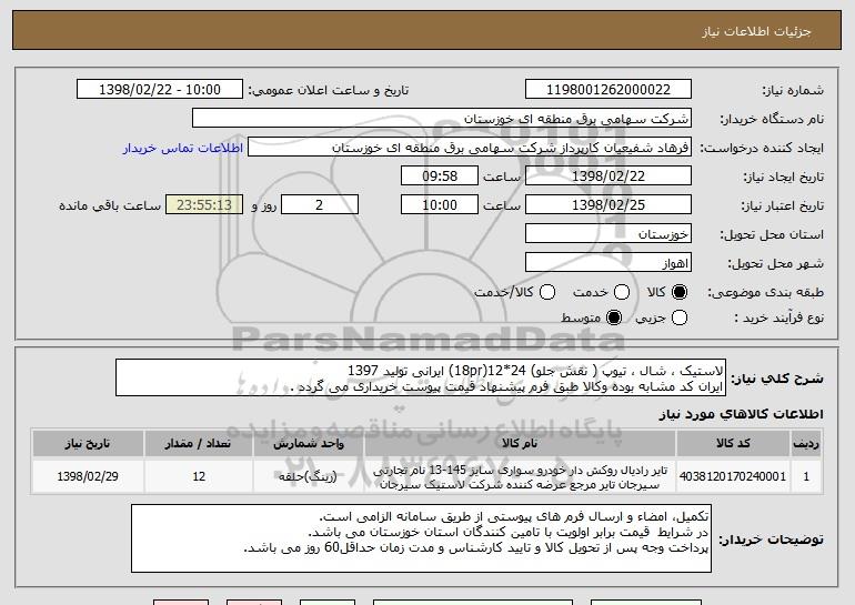 استعلام لاستیک ، شال ، تیوپ ( نقش جلو) 24*12(18pr) ایرانی تولید 1397 ایران کد مشابه بوده وکالا طبق فرم پیشنهاد قیمت پیوست خریداری می گردد ., استعلام لاستیک ، شال ، تیوپ ( نقش جلو) 24*12(18pr) ایرانی تولید 1397 ایران کد مشابه بوده وکالا طبق فرم پیشنهاد قیمت پیوست خریداری می گردد .