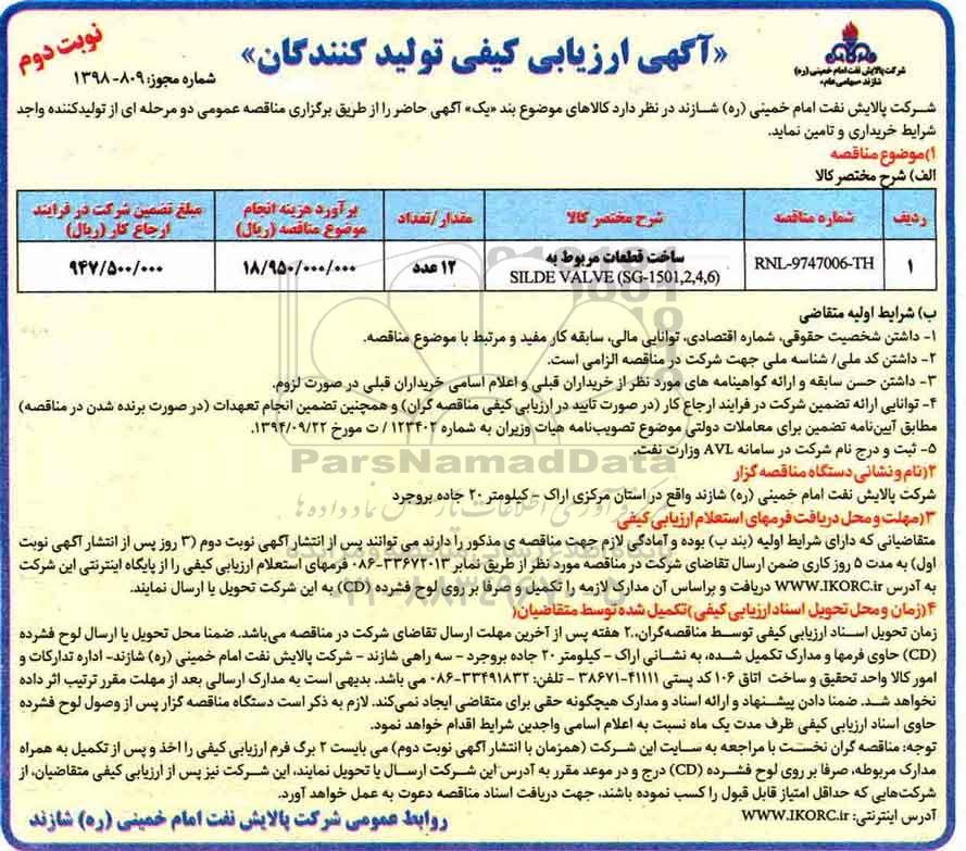 مناقصه ساخت قطعات مربوط به SILDE VALVE SG-1501-2.4.6-نوبت دوم از کلیه افراد متخصص و شرکتها واجد شرایط دعوت به عمل میآید در مناقصه با کد خبرگزاری پارس نماد: 1636231 شرکت نمایند.