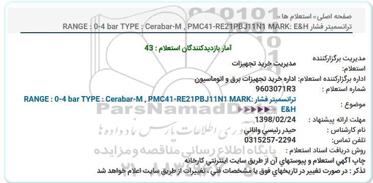 استعلام بها و موضوع استعلام استعلام, استعلام ترانسمیتر فشار RANGE : 0-4 bar TYPE : Cerabar-M , PMC41-RE21PBJ11N1 MARK: E&H به اطلاع کلیه شرکتها و افراد متخصص واجد شرایط میرساند، آگهی گذار در نظر دارد از طریق استعلام بها، نسبت به انتخاب و دریافت پیشنهادات اقدام نماید. این استعلام با کد آگهی ثبت شده در سامانه خبرگزاری پارس نماد : 1637506 منتشر شده است. مشخصات استعلام : تاریخ شروع استعلام: 1398/02/22 آخرین مهلت ارسال پیشنهاد قیمت : 1398/02/24 و محل اجرای پروژه : استان اصفهان میباشد. استعلام قیمت مورد درخواست : استعلام, استعلام ترانسمیتر فشار RANGE : 0-4 bar TYPE : Cerabar-M , PMC41-RE21PBJ11N1 MARK: E&H با دستهبندیهای تخصصی و گروه های مرتبط : ابزار دقیق, تجهیزات برق و الکترونیک, استعلام اطلاع رسانی میگردد.