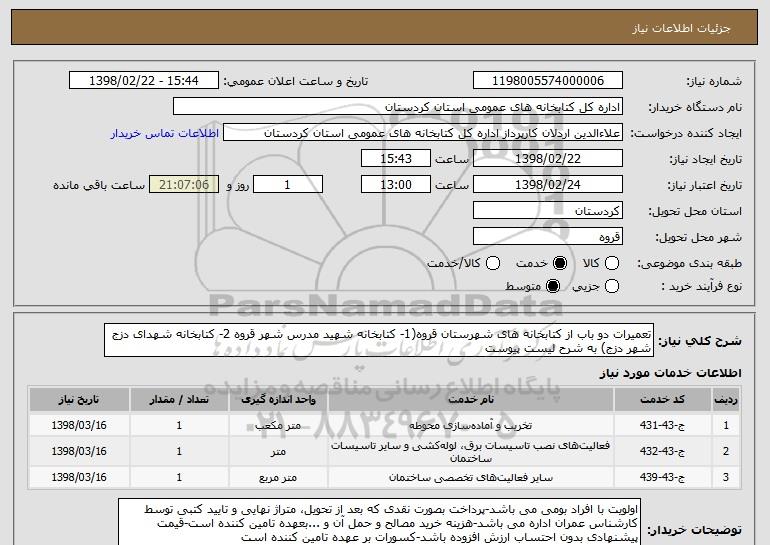 شرح کلی نیاز: تعمیرات دو باب از کتابخانه های شهرستان قروه(1- کتابخانه شهید مدرس شهر قروه 2- کتابخانه شهدای دزج شهر دزج) به شرح لیست پیوست