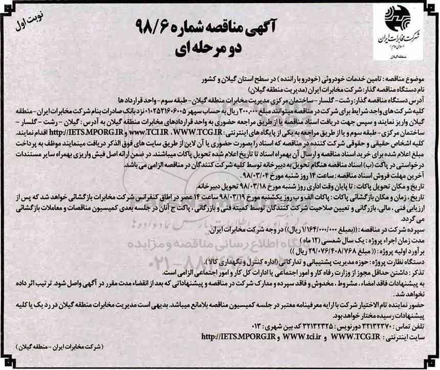 آگهی مناقصه شماره 98/6 دو مرحله ای ؟