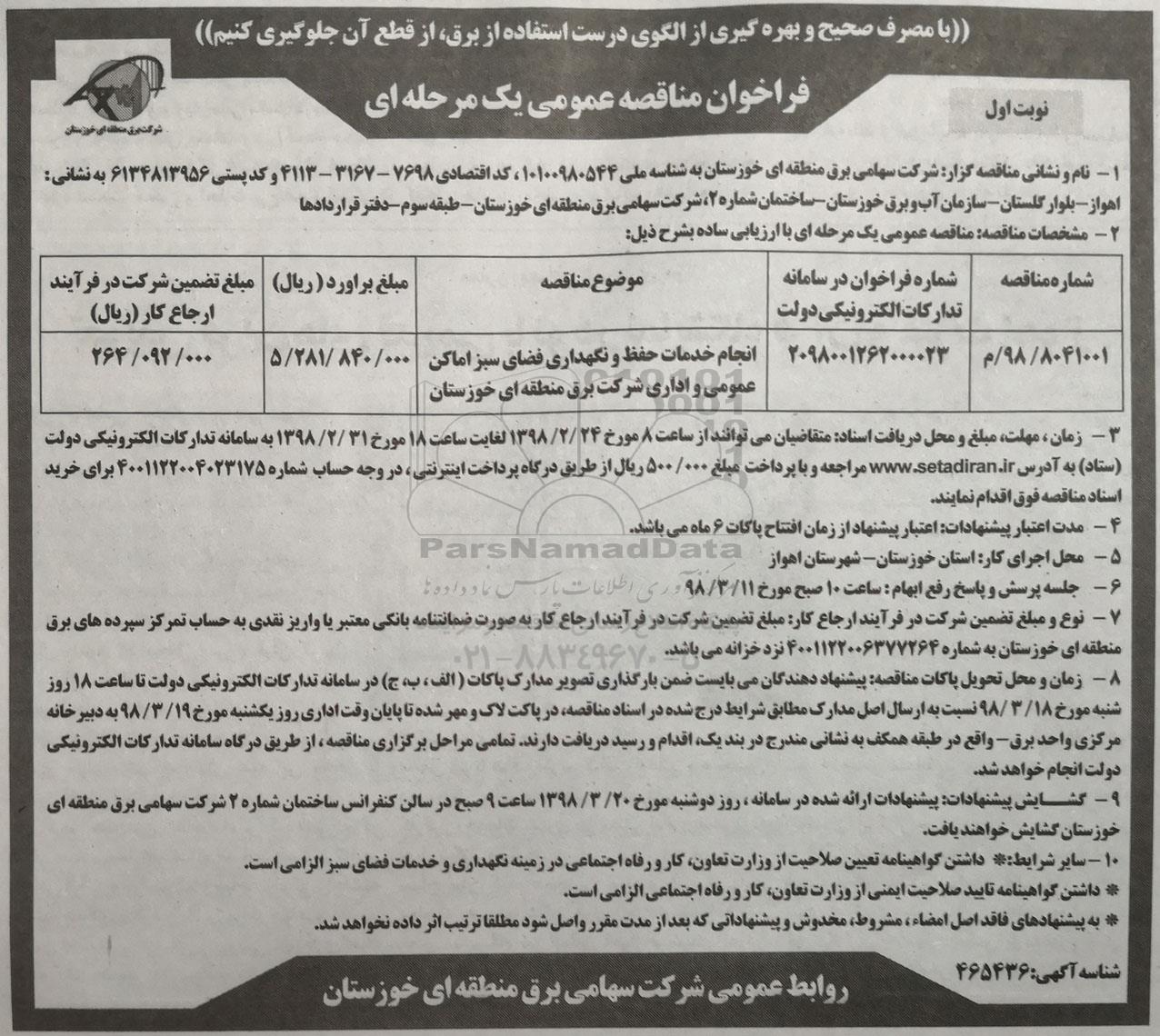 | 98/8041001/م | 2098001262000023 | انجام خدمات حفظ و نگهداری فضای سبز اماکن عمومی و اداری شرکت برق منطقه ای خوزستان |
