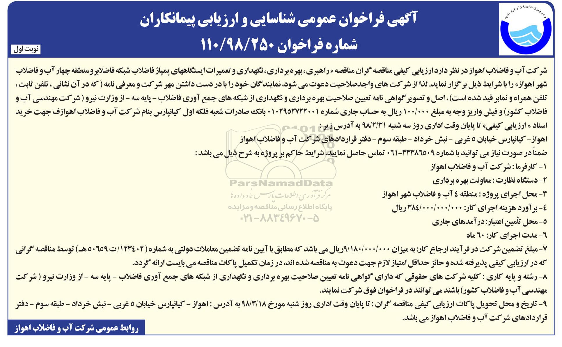 شرکت آب و فاضلاب اهواز در نظر دارد ارزیابی کیفی مناقصه گران مناقصه راهبری ، بهره برداری ، نگهداری و تعمیرات ایستگاههای پمپاژ فاضلاب و شبکه فاضلابرو منطقه چهار آب و فاضلاب شهر اهواز را با شرایط ذیل برگزار نماید لذا از شرکت های واجدصلاحیت دعوت می شود نمایندگان خود را با در دست داشتن مهر شرکت و معرفی نامه (که در آن نشانی، تلفن ثابت، تلفن همراه و نمابر قید شده است)اصل و تصویر گواهی نامه تعیین صلاحیت بهره برداری و نگهداری از شبکه های جمع آوری فاضلاب - پایه سه- از وزارت نیرو (شرکت مهندسی آب و فاضلاب کشور) و فیش واریز وجه به مبلغ ۱۰۰،۰۰۰ریال به حساب جاری شماره ۰۱۰۲۹۵۲۷۲۲۰۰۱ بانک صادرات شعبه فلکه اول کیانپارس بنام شرکت آب و فاضلاب اهواز ، جهت خرید اسناد ‹‹ارزیابی ›› تا پایان وقت اداری روز سه شنبه 98.2.31 به آدرس زیر: